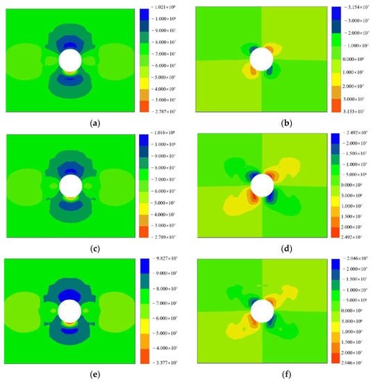 After the tunnel excavation, the horizontal maximum principal stress was approximately in line with the tunnel axis, ignoring its influence on the tunnel surrounding rock. The horizontal intermediate principal stress was approximately perpendicular to the tunnel axis, and the self-weight stress was the minimum principal stress. Provided that support measures were not used, under the influence of horizontal tectonic stress, a compressive stress concentration with a maximum value of 102.4 MPa appeared in the slightly altered surrounding rock section at the top and bottom 7.0 m of the chamber’s depth, and gradually decreased to the initial stress state as the distance from the chamber increased, as shown in Figure 2a. Under the influence of chamber excavation and unloading, a stress reduction zone with a value of 54.6 MPa and influence depth of 16.0 m appeared in the surrounding rock on both sides and at the top of the chamber. Shear stress concentration appeared at the top and bottom corners of the cavern, and its maximum value was 29.5 MPa, as shown in Figure 2b. Compressive stress concentration with a maximum value of 87.36 MPa appeared in the medium alteration surrounding rock section 20 m at the top and bottom corners of the cavern, and gradually decreased to the initial stress state as the distance from the cavern chamber increased; the influence depth was 28.0 m, as shown in Figure 2c. A stress reduction zone appeared in the surrounding rock on both sides of the cavern chamber and at the top and bottom; its value was 42.3 MPa and its influence depth was 32.0 m. Shear stress concentration appeared at the top and bottom corner of the cavern, and its maximum value was 19.15 MPa, as shown in Figure 2d. In the strongly altered surrounding rock section, compressive stress concentration occurred at a depth of 13.0 m from the bottom of the cavern, and had the maximum value of 107.8 MPa, as shown in Figure 2e. In addition to the bottom of the cavern, a stress reduction zone with the minimum value of 49.04 MPa and small main stress influence depth of 35 m existed around the cavern. Shear stress concentration with an influence depth of 12.0 m existed at the top and bottom corners of the cavern. The maximum value was 19.7 MPa, as shown in Figure 2f. The depth of stress influence was significantly higher in the moderately altered and strongly altered surrounding rocks compared to the slightly altered surrounding rock.
