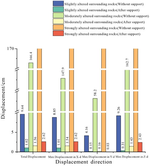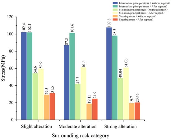 The comparison between the stresses in the unsupported and supported cavern chambers is shown in Figure 4. As can be seen from the support, except for the strong alteration surrounding the rock section, owing to the occurrence of surrounding rock damage deformation and X-direction compressive stress reduction, the other stresses were increased by the surrounding rock owing to the restraining effect of the support structure.