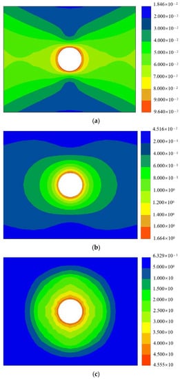 Displacement diagram of the tunnel excavation under unsupported conditions. (a) Total displacement diagram of the slightly altered surrounding rock section. (b) Total displacement diagram of the moderately altered surrounding rock section. (c) Total displacement diagram of the strongly altered surrounding rock section.