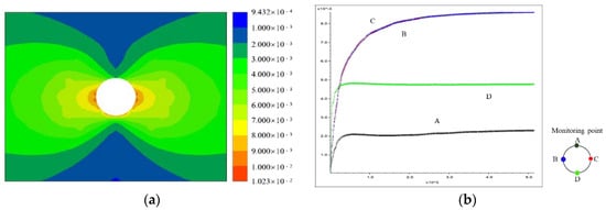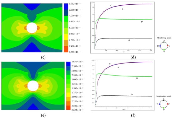 In the calculation process, to monitor the deformation evolution process of each type of surrounding rock after tunnel excavation, displacement monitoring points were set at the top plate, both walls, and bottom plate of the cavern; the monitoring results are shown in Figure 7b,d,f. It can be seen that after the use of support measures, the displacement monitoring amount of all types of surrounding rocks in the cavern was significantly reduced, and the surrounding rocks of the tunnel exhibited the largest displacement at the cavern side walls, followed by the bottom slab and smallest top slab. Among them, the displacement of the top plate of the slightly altered surrounding rock was 0.23 cm, the maximum displacement of both walls was 0.86 cm, and the displacement of the bottom plate was 0.48 cm. The maximum displacement of the top plate of the moderately altered surrounding rock was 0.32 cm, the maximum displacement of both walls was 1.30 cm, and the maximum displacement of the bottom plate was 0.88 cm. The displacement of the top plate of the strongly altered surrounding rock was 0.56 cm, the maximum displacement of both walls was 2.19 cm, and the displacement of the bottom slab was 1.62 cm.