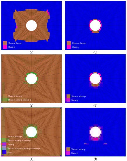 Cloud map of the plastic zone after tunnel excavation. (a) Cloud map of the plastic zone of the slightly altered rock section (without support). (b) Cloud map of the plastic zone of the slightly altered rock section (after support). (c) Cloud map of the plastic zone of the moderately altered rock section (without support). (d) Cloud map of the plastic zone of the moderately altered rock section (after support). (e) Cloud map of the plastic zone of the strongly altered rock section (without support). (f) Cloud map of the plastic zone of the strongly altered rock section (after support).