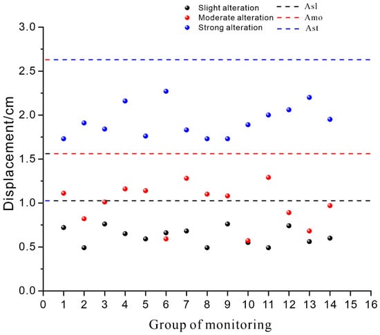 During the tunnel boring process, it was found that the deformation of the steel arch was mainly concentrated within 24 h after excavation, after which it gradually stabilized, and the final deformation was less different to the 24 h monitoring value. Therefore, 14 monitoring points with different degrees of alteration were randomly selected for each section of the excavation, and the above-mentioned support method was used to monitor and count the displacement changes of the steel arch after 24 h. The actual monitoring values are presented in Table 7 and Figure 9. Among them, the deformation of the steel arch in the slightly altered rock section ranged from 0.49 to 0.76 cm, and the average value was 0.62 cm. The deformation of the steel arch in the moderately altered rock section ranged from 0.57 to 1.29 cm, and the average value was 0.97 cm. The deformation of the steel arch in the strongly altered rock section ranged from 1.73 to 2.27 cm, and the average value was 1.93 cm.
