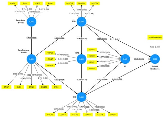 The raw data from respondents without outdoor play yards were excluded from analysis. The indicators in Table 4 operationalize the four components evaluating the importance of outdoor play to early childhood development and learning. With an overall mean score of 4.485, social and emotional development was determined to be the most important of the four aspects. Cognitive development came in s with an overall mean score of 4.49, while health and physical development came in third with an overall mean score of 4.46. With an overall mean score of 4.42, academic learning is considered as the least significant of the four constructs. In Table 4, the indicators for these four constructs have skewness values ranging from −1.494 to 0.345, and kurtosis values ranging from −1.935 to 1.338, showing that these indicators do not depart from the normality requirements according to Brown (cited in [80]).