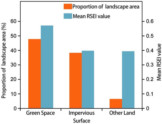 The results demonstrated that the proportion of green space in the study area was the largest, the degree of fragmentation was the lowest, and the shape was the most regular and concentrated. As mentioned above, the factors affecting the RSEI were diverse, such as the nature of the land-cover and the acquisition time of the satellite data [