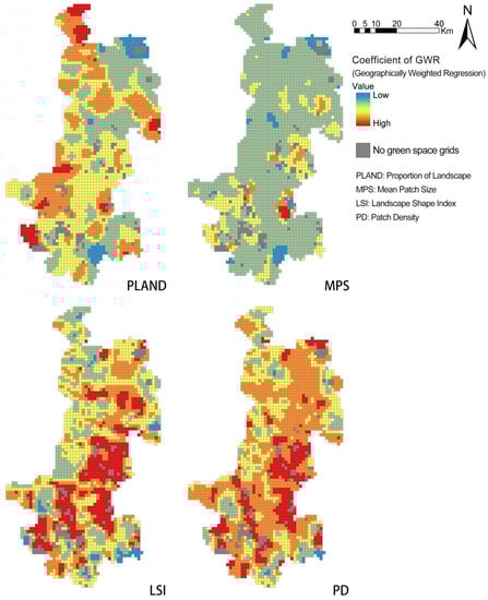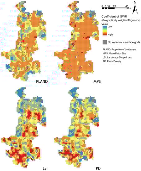 Table 11, the landscape pattern metrics of green space and impervious surface had opposite correlation coefficients with the RSEI, and these correlations varied with different spatial locations (
