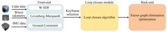 In this study, multiple sensor data are fed into the SLAM algorithm to create sensor fusion and start building an environment map. Figure 1 illustrates the framework of the proposed SLAM system based on LiDAR, IMU and wheel odometry in this paper. First, the front-end scanning and matching module receives three types of sensor information to estimate the motion of an unmanned vehicle, and improves the front-end matching accuracy by adding ground constraints. If the unmanned vehicle moves a certain distance, the key frame selection automatically chooses whether to generate a new key frame according to the coverage of the current unmanned vehicle pose. Second, when a new key frame is obtained, the closed-loop module automatically performs closed-loop detection and rejects the effects of an incorrect closed-loop on the simultaneous localisation and map-building. Finally, the back-end optimisation module optimises the positional maps using factorial elimination elements to obtain faster and more stable poses. Details of these three modules of the system are provided below.