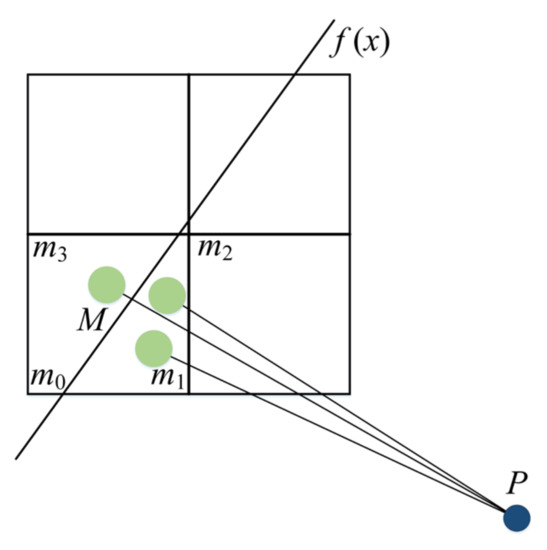 In the SDF map, the detected object contour is described using a straight line fitted to laser scan points within the same raster. The object contour is described in the SDF with the accuracy of the subgrid size. The SDF value represents the distance from the raster to the regression line, and determines the sign of the current raster. As the regression line passes through the raster, the absolute value of the calculated SDF value is smaller than the raster size, so the map is smaller than the size of the original raster. As shown in Figure 2, are the four vertices of a raster, Deming regression is used to fit three laser points to obtain a straight line f(x), and the distance between the midpoint of raster M and f(x) is the SDF value of raster M. The SDF value is updated to a positive value according to the raster when the distance from the raster to the unmanned vehicle position P is less than the distance from P to f(x), and the opposite SDF value is negative. The SDF map uses the average of all time measurements when updating the object contour using the SDF, thus reducing the errors caused by sensor noise. A weighted distance method is used in the 3D reconstruction [35], and the SDF map is weighted for each update in order to reduce the effects of noise and smooth the updated values.