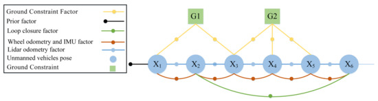In this study, we fused information from multiple constraints to obtain high-accuracy unmanned vehicle trajectories while using factor graphs to model the graph optimisation problem. The factor graph is shown in Figure 3. There are five factors in the factor graph: the a priori factor, wheel odometer and IMU factor, LiDAR odometer factor, closed-loop factor, and ground constraint factor [38].
