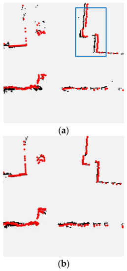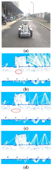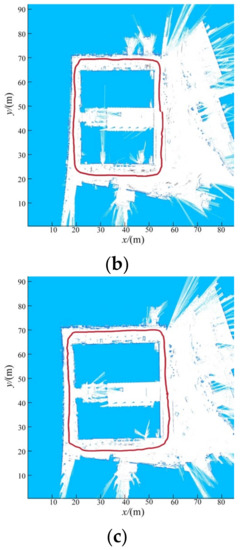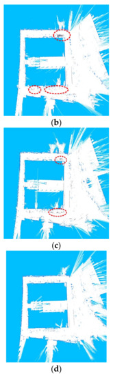 According to the results shown in the figures, it can be seen from Figure 9b,c that there are evident unrecognized areas and more confusing burrs from the other two approaches, whereas the maps built by the proposed algorithm (shown in (d) are more regular and do not show the situations that occur in the above two algorithms.