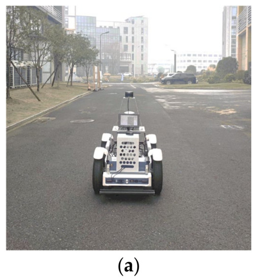 The first scene was a non-motorized parking promenade, shown in Figure 9a. By collecting similar promenade information and without using a tight wall as a constraint, the SLAM building map was expected to present greater difficulties, as the map would be prone to certain scenes that could not be identified or that missed detection. As such, this experiment was a good test of the recognition ability and stability of the proposed algorithm, along with those from the Hector and Cartographer algorithms.