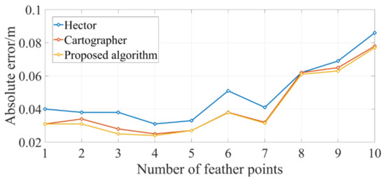 In the experimental office building scenario, all three algorithms show a better map-building effect. The absolute errors of the calculations are shown in Figure 15, indicating that the proposed algorithm has higher accuracy than the other two algorithms, reflecting the adaptability of the algorithm of this paper to various environments. A specific error comparison is shown in Figure 16, in which we can see that the error of the proposed SLAM algorithm is reduced by 16.59% compared with the Cartographer algorithm and by 22.65% compared with the Hector algorithm.
