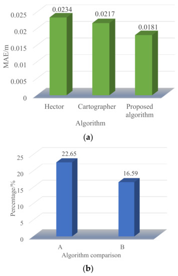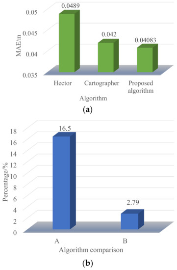 Promenade error variation diagram. (a) Comparison of mean absolute errors (b) Comparison of algorithm enhancement (A: Hector vs. proposed algorithm; B: Cartographer vs. proposed algorithm).