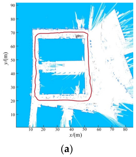 To demonstrate the map-building capabilities of the algorithm, experiments were conducted in an outdoor promenade-type environment and complex laboratory environment on the periphery of a large building. The following is the experimental results’ diagram: in the red circle in the gray part of the unidentified area, dark blue is the obstacle and white is the ground.