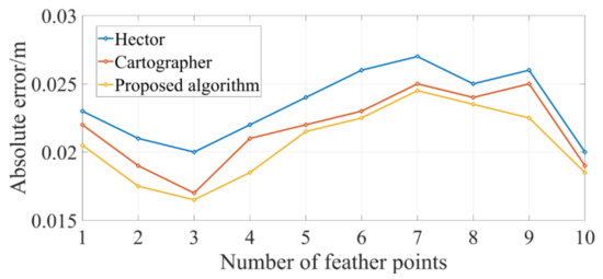 In the outdoor promenade environment, all three algorithms show good performance. The absolute errors of the three algorithms are calculated as shown in Figure 12, but the error of the proposed algorithm in this paper is significantly lower than the error of the other two algorithms, which is more favorable as regards accuracy when building the map. A specific error comparison is shown in Figure 13, which shows that the error of the proposed SLAM algorithm in building the map is reduced by 2.79% compared with the Cartographer algorithm and by 16.50% compared with the Hector algorithm.
