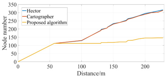Figure 17 shows the relationship between the number of nodes and the running distance when the office building map is built. To verify the effectiveness of the algorithm selection strategy, the numbers of nodes in the bit-posture map during the operations of the three algorithms were extracted. Figure 17 shows that the number of nodes in the Hector and Cartographer methods increases with the length of the unmanned vehicle trajectory. However, the number of nodes tends to stabilize after the unmanned vehicle travels a certain distance. When the distance traveled by the unmanned vehicle increases, the memory occupation of the Hector and Cartographer keeps increasing, and all the memory can become occupied when building a larger map. This does not happen with the proposed method. The experimental results show that the proposed factor graph elimination optimisation can significantly reduce the memory occupancy of the algorithm and improve the computational efficiency and stability of the algorithm.