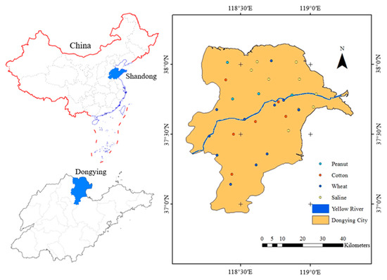 Based on the current land use of the Yellow River Delta and field surveys, soil samples were collected in May 2020 throughout Dongying City, Shandong Province, China. A total of 210 soil samples were collected at 7 depth layers of 0–5 cm, 5–10 cm, 10–20 cm, 20–40 cm, 40–60 cm, 60–80 cm, and 80–100 cm in 30 sampling sites of different land use types in the Yellow River Delta (Figure 1). Based on the main crop types and planting areas in spring, we selected winter wheat (a major food crop), cotton, and peanuts (major cash crops) as model crops with widely distributed native saline soils as reference background values. In total, 9 saline soils, 11 wheat, 6 cotton, and 4 peanut sample plots were selected from randomly distributed standard farmlands throughout Dongying City.