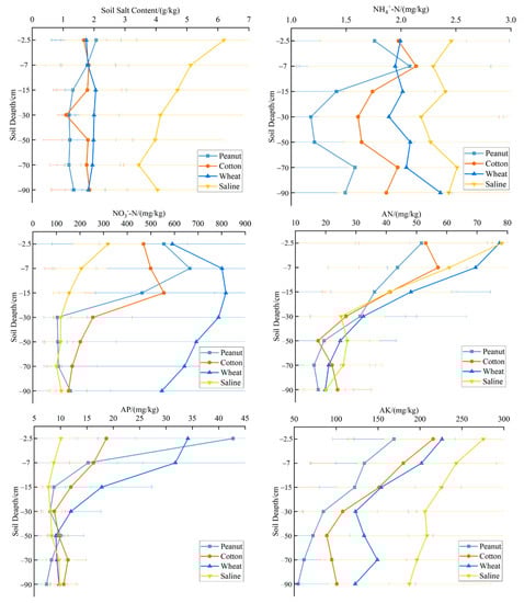 Soil nitrate nitrogen (NO3−-N) content was significantly higher in the three croplands than that of the saline soil (Table 1) and soil NO3−-N content was overall higher above the 30 cm depth than that in the deep soil (Figure 2), which is consistent with most studies [52,53]. Soil NO3−-N was highly leachable and susceptible to various factors such as nitrogen application, irrigation, precipitation, and temperature. The soil NO3−-N content was positively correlated with soil nitrogen content (Figure 6). SWC and salt contents were high in saline soil, which inhibited nitrification of soil nitrogen. At the same time, NO3−-N was easily leached and migrated with water to the deeper layers, which promoted anaerobic respiration. Thus, high salt contents enhanced soil denitrification [54], leading to the reduction of NO3−-N content. Long period reclamation, such as nitrogen fertilizer application reduced salt content and salt tolerance of crops, resulted in high soil NO3−-N content in all three croplands, especially in wheat [13]. When soil NO3−-N was applied greater than the crop’s needs, NO3−-N was transported deeper into the soil with water and accumulated in the surface soil [55]. Therefore, the NO3−-N content in the surface soil gradually increased, showing an obvious phenomenon of surface accumulation. With the increase of soil depth, the surface soil nitrogen was absorbed by the surface root system in large quantities, which made the NO3−-N content of the deep soil gradually decrease. Moreover, the three croplands had different growth cycles and slightly different in root distribution ranges, with the root system of wheat reaching 40 cm and peanut cotton only 20 cm. Therefore, the depth at which the turnaround occurred was different, and the soil NO3−-N content of wheat was higher at all depths.