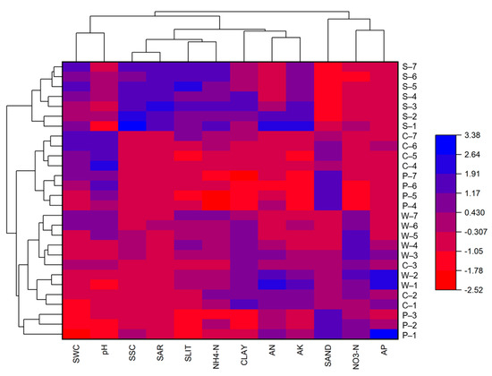 Heat map of cluster analysis of different land use types. Note: P stands for peanut, C stands for cotton, W stands for wheat, and S stands for saline bare soil; the seven depths of 0–5 cm, 5–10 cm, 10–20 cm, 20–40 cm, 40–60 cm, 60–80 cm, and 80–100 cm are indicated by −1, –2, –3, –4, –5, –6, and –7, respectively.