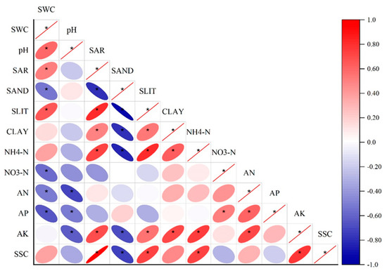 Correlation analysis of soil physical and chemical properties of different land use types. Note: * indicate significant correlation at the 0.05 levels.
