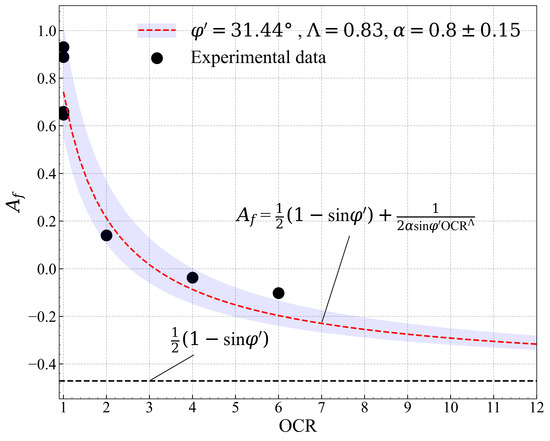 The experimental results of under different values of OCR are presented in Figure 7. It can be seen that increases non-linearly with increasing OCR, and = 0.96 for OCR = 2, = 1.36 for OCR = 4, and = 1.60 for OCR = 6. The red dashed line is drawn using Equation (11) with = 31.44, = 0.83, and α = 0.8 ± 0.15. Almost all of the experimental data fall within the range between the upper and lower limits.