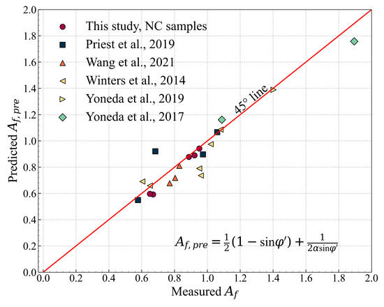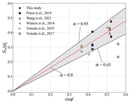 In this study, is equal to ~0.8. In addition, the test results are mostly located between the scope of an range from 0.65 to 0.95, which also can be seen in Table 1. However, the measured values of Yoneda et al. [39] are outside this scope. This is because the non-uniform deformation (i.e., shear banding or bottom failure) occurs during undrained tests leading to a resultant low shear strength [39]. Consequently, these findings infer that although values of differ between areas, the linear relationship shown in Equation (9) could be reasonably assumed for NC clayey-silty sediments of existing hydrate reservoirs.