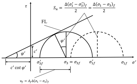 To visualize Equation (6), the stress state of sediments at failure is shown in Figure 2. The solid-line circle is the effective stress Mohr circle, and the dashed-line circle is the total stress Mohr circle. The failure of the sediments occurs once the effective stress Mohr circle touches the failure line (FL). According to the effective stress principle [34], the distance between the total and effective Mohr circles is equal to the value of . Undrained shear strength can be depicted by the radius of the Mohr circle (i.e., ). The effective confining pressure is equal to the initial minor principal stress for sediments under isotropic consolidation with initial major principal stress = 0.