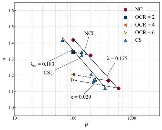 The volume-change characteristics of statured clayey-silty sediments corresponding to effective consolidation stresses are key indices for the geotechnical design (e.g., stability and deformation problems) and important inputs for the numerical simulation (e.g., the Cam-clay model [9]). Figure 3 shows evolutions of the void ratio e of the specimens during isotropic loading and unloading in a semi-logarithmic coordinate. Since the specimen has no volume change, the void ratio is constant during undrained shearing. The solid lines denote the normally consolidated line (NCL) and the critical state line (CSL). NCL is related to the volumetric response under isotropic compression loading, whereas CSL is corresponding to the volume of specimens at a critical state (CS). The slope of NCL is the isotropic compression index , and that of CSL is the isotropic compression index at a critical state . Although values of and in Figure 3 are slightly different, NCL is approximately parallel to CSL which is in accordance with the critical state soil mechanics [9]. The dashed line is the swelling curve, and its slope is the isotropic swelling index with a value of 0.029 in this study.