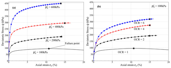 Figure 4 shows the stress–strain curves of NC and OC specimens. The failure point is marked by a star point. The failure of specimens is defined as deviatoric stress q attained at maximum or q at 15 % axial strain, whichever is obtained first during a test. Both increasing and OCR can reduce the porosity of specimens leading to enhancing the shear strength. In Figure 4a, the value of deviatoric stress at failure increases with increasing , and values of are 95.21 kPa, 189.54 kPa, 295.36 kPa, and 449.36 kPa for = 100 kPa, 200 kPa, 400 kPa, and 600 kPa, respectively. As shown in Figure 4b, the of OC specimens obviously increases with increasing OCR. In addition, the of OC specimen with OCR = 4 is 272.62 kPa, which is approximately equal to that of the NC specimen at = 400 kPa. It also can be seen in Figure 3 that the of the OC specimen with OCR = 4 is approximately equal to that of the NC specimen at . This finding infers that there is a corresponding relationship between and e for saturated clayey-silty sediments [37], which is consistent with previous results [9].