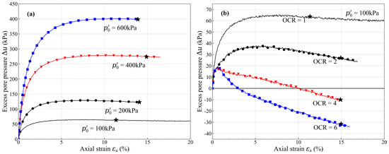 Excess pore water pressure versus axial strain curves of (a) NC specimens and (b) OC specimens.