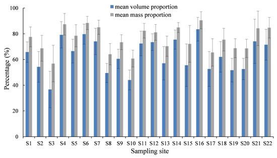 The mean volume proportion of the coarse fragment for all 22 soil profiles was 63.3%, with the smallest value of 36.7% detected in soil profile S3 and the largest value of up to 90.5% in S16 (Figure 2). For all 170 samples collected from 22 soil profiles, the average volume proportion of the coarse fragment was about 63.3%, ranging from 13.0% to 92.3%. The average mass proportion of the coarse fragment was more than 75%, with a maximum of more than 90% in S16. Overall, the coarse fragment dominated the soil texture composition in the MTZ.