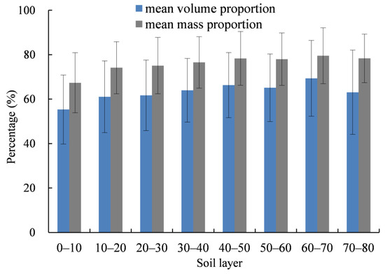 In terms of the vertical distributions, the volume and mass proportions of the coarse fragment all exceeded 50% (Figure 3). The highest volume (69.3%) and mass (79.5%) proportions were detected at a depth of 60–70 cm, whereas the lowest volume (55.3%) and mass (67.4%) ratios occurred at a depth of 0–10 cm. On the whole, the volume and mass proportion of the coarse fragment tended to increase gradually from the surface to the deep soils.
