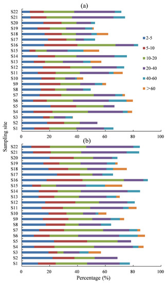 As shown in Figure 4, the mean volume and mass proportions of the coarse fragment varied at different particle size ranges (i.e., 2–5, 5–10, 10–20, 20–40, 40–60, and >60 mm). The largest volume proportion was detected at a particle size diameter of 20–40 mm (16.1%), followed by 10–20 mm (14.9%), and the least was at >60 mm (4.7%). Similar results were also detected for the mean mass proportion of the coarse fragment. The measured soil porosity of 24 coarse-fragment soil samples collected from three soil profiles (i.e., S14, S16, and S21) ranged from 10.4% to 21.2% with a mean of 15.2%.