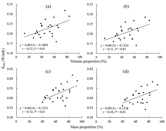 Relationship of Kdry (thermal conductivity under the dry state) of the coarse-fragment soil at 20 °C (a,c) and −20 °C (b,d) with the volume and mass proportion of the coarse fragment for 24 samples.