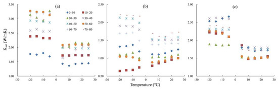 For thermal conductivity under the saturated state, Ksat did not obviously change with temperature at the two designated temperature ranges, that is, from −20 °C to −5 °C (frozen state) and from 5 °C to 25 °C (unfrozen state, Figure 8). The difference in Ksat between frozen and unfrozen states was large, with relatively high values in the frozen state compared with the unfrozen state (Figure 8; Table 1). In addition, we also found that the thermal conductivity values at 0 °C were remarkably different from those at other designated temperatures, as shown in Table 1.