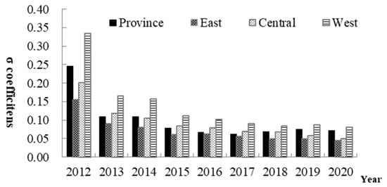 While the coupling coordination degree between digital finance and AMID presents a rapid growth trend, there is still a great difference between various provinces (see Figure 1). In 2012, the coupling coordination degree of digital finance and AMID of Guangdong was highest and was 3.3 times than that of Xinjiang (0.227), which was the lowest. The eastern region (0.684) was 1.35 times than that of the western region (0.508) (see Table 3). In 2020, the ratio reduced to 1.39 and 1.1, respectively, indicating that the differences of coupling coordination degree among provinces and regions are gradually narrowing down. The convergence coefficient of σ can be used to analyze the difference of the coupling coordination degree of digital finance and AMID in each province from the overall average level. If the convergence coefficient σ decreases, it can be concluded that the coupling coordination degree of digital finance and AMID has a convergence trend, indicating that the gap between provinces or regions is gradually narrowing down. Convergence coefficients σ of provincial and regional coupling coordination degree of digital financial and AMID are calculated by Equation (4), and results are shown in Figure 1.