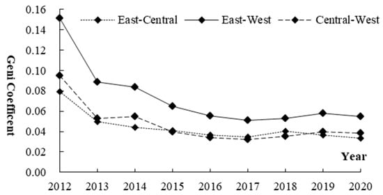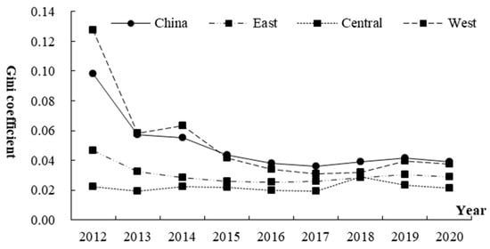 The overall Gini coefficient (G), intra-regional Gini coefficient (Gw) and inter-regional Gini coefficient (Gnb) of the coupling coordination degree between digital finance and AMID were calculated by Equations (5)–(7), and results are shown in Table 4. The overall Gini coefficient of coupling coordination showed a downward trend of volatility, from 0.098 in 2012 to 0.039 in 2020, with a decrease of 0.059. It proves that the differences in overall coupling coordination degree of digital financial and AMID is narrowing, which is consistent with the results of σ convergence model. The intra-regional differences of the coupling coordination degree of digital finance and AMID in the east, middle and west also showed a decreasing trend of volatility (see Figure 2). From 2012 to 2020, the mean value of intra-regional differences in the western region was the highest (0.052), followed by that of the eastern region (0.030) and central region (0.022), while the standard deviation was the highest in the western region (0.029), followed by the eastern region (0.006) and central region (0.003). By comparison, the intra-regional difference of coupling coordination degree in the western region was the largest, and its fluctuation was more violent, while the intra-regional differences in the eastern region was the smallest, and the fluctuation was moderate. In terms of decreasing amplitude, the provincial difference in the western region showed a rapid decreasing trend, from 0.127 in 2012 to 0.038 in 2020, with an average annual changing rate of 0.73%. The changes of intra-regional differences in the eastern and central regions were relatively gentle and decreased from 0.046 and 0.022 in 2012 to 0.029 and 0.021 in 2020, respectively.