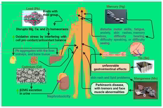 A severe infection can develop from Hg exposure. Depending on the kind, dose, manner, and duration of exposure, the most common symptoms of Hg poisoning are impaired motor skills, fatigue, anxiety, skin rashes, memory loss, difficulty hearing, difficulty speaking, or difficulty seeing. In extreme cases of MeHg poisoning, Minamata disease can develop [46]. Hg poisoning has been hypothesized to cause pink disease (acrodynia), characterized by a rosy rash and flaking skin. MeHg exposure in youngsters has been linked to various serious health issues later in life, such as renal disease and cognitive impairment. Long-term, low-dose exposure to MeHg has not been fully elucidated. Hg poisoning is one means by which suicide attempts are carried out. Hg levels can be measured in bodily fluids, such as blood, urine, and hair, but the results are not always accurate [43] (Table 1 and Figure 1).