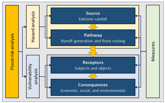 The source can be defined as the cause or origin of a hazard. In the context of pluvial flash floods, the source is a heavy rainfall event that typically occurs within a short period of time and results in high runoff (hydrological analysis). The pathway describes the dynamics of surface water flow toward a receptor (hydraulic analysis), which is related to the topographic characteristics of the flooded area, soil properties (infiltration), and imperviousness. Receptors are the objects and subjects (population, buildings, road network, land, etc.) that are exposed to a hazard and are potentially susceptible to negative consequences (vulnerability analysis). It should be noted that a pathway must exist between the source and a receptor for a risk to occur. The term consequences includes negative impacts such as economic (e.g., property damage, crop destruction, loss of livestock), social (e.g., loss of life, injury, loss of cultural property), or environmental (e.g., soil and/or water contamination, public health degradation) that may result from a receptor’s exposure to a hazard [44,58].