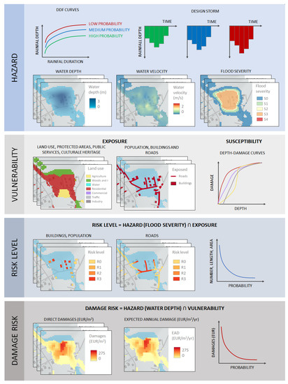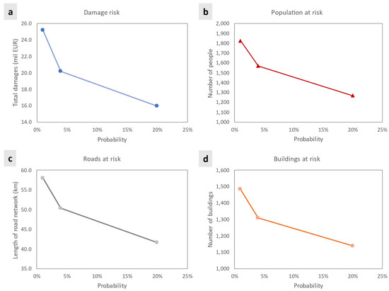 Finally, all risk maps were spatially integrated to provide a quantitative measure of flood risk at the catchment level by calculating direct damages, population density, length of roads, and number of buildings at risk for a given range of flood probabilities.