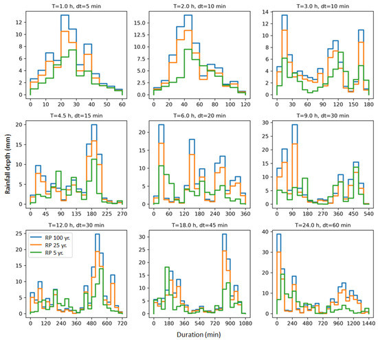 Pluvial flash flood hazard was analyzed for three probabilities: (a) low probability (100-year return period), (b) medium probability (25-year return period), and (c) high probability (5-year return period). For each probability, six simulations were run for different rainfall durations defined by a corresponding design storm (see Figure 3). Simulation results—water depth, water velocity, and flood severity—were mapped by calculating the envelope over the entire rainfall duration for each probability.