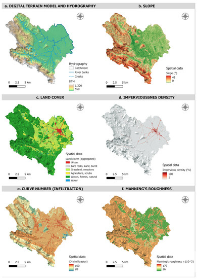 Spatial data used for flood hazard analysis in the Gospić catchment: (a) digital terrain model and hydrographic network, (b) terrain slope, (c) aggregated land-cover, (d) imperviousness density, (e) curve number CN for infiltration, and (f) Manning’s roughness coefficient.
