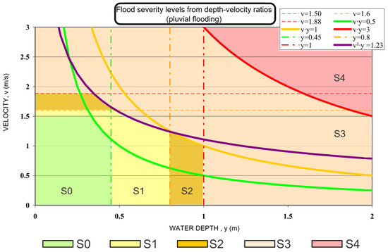 Flood severity levels from depth–velocity rations for pluvial floods as defined by the SUFRI methodology [44].