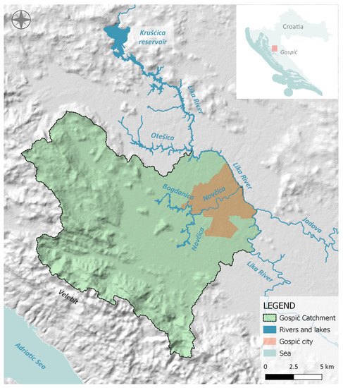 The town of Gospić is located in the central part of the Lika River basin. This is a 64.5 km-long perennial river that sinks into several smaller and larger sinkholes and flows underground [80]. Its catchment area is 1227 km2. High water levels occur in winter, while it nearly dries up in summer, so there are large seasonal variations. In this study, we focused on the Gospić catchment, which includes the river Novčica (which flows into the Lika River) with its tributary Bogdanica (see Figure 7). The total area of the Gospić catchment is 238 km2.