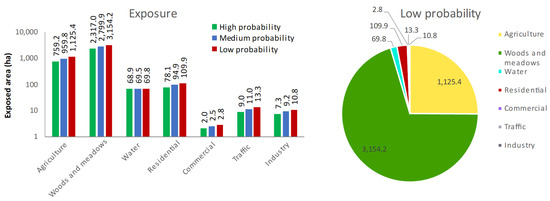 The vulnerability to pluvial flooding was conducted with the aim of determining the risk, which is presented in the next section. In this section, the results of the exposure analysis for pluvial flash floods are presented. Figure 12 shows an example of an exposure map for a low probability in the Gospić catchment. The exposure analysis identified land-uses (aggregated into six major classes) within the flood extent for a low probability and all identified receptors from the category of public services, potential pollution sources, protected areas, and cultural heritage.