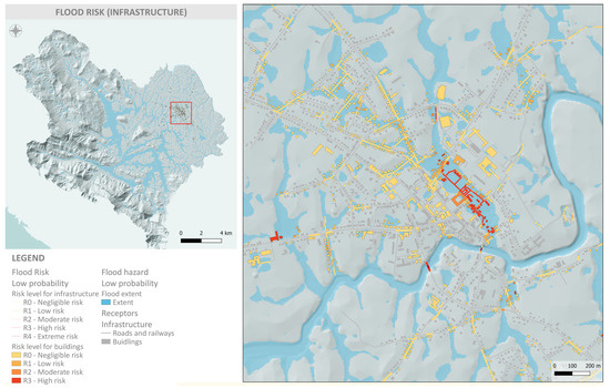 The qualitative risk was estimated by overlaying the exposure of selected receptors (people, buildings, and roads) with the flood severity map. Due to the lack of more detailed data, susceptibility was neglected at this stage and a risk level was assigned directly as a one-to-one function of flood severity, e.g., a receptor exposed to a flood severity of S1 was assigned a risk level of R1 for a given probability scenario (H, M, or L). This risk analysis focused on the social flood risk category by emphasizing flood severity (loss of stability, injuries, fatalities, traffic disruptions, etc.), rather than damage.