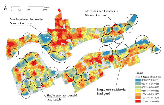 19]. Abdullahi performed proximity analysis on five land use types—residential, community facilities, open space, commercial, and industrial areas—and aggregated them according to equal weights to obtain the land mix characteristics of Kajang, Malaysia [