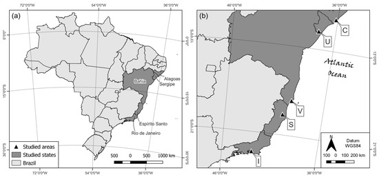 - Machado, M.A.B.L.; de Carvalho Chaves, L.D.F.; Neto, J.L.R.; de Lyra-Lemos, R.P. Florística do estrato arbóreo de fragmentos da Mata Atlântica do Nordeste oriental, município de Coruripe, Alagoas, Brasil. Rev Ouricuri. 2012, 2, 55–72. [Google Scholar]