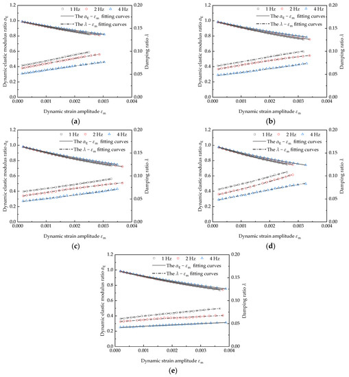 - With an increase in loading frequency, the dynamic elastic modulus ratio and reference dynamic strain amplitude tend to increase slightly, while the damping ratio decreases obviously. Moreover, the dynamic elastic modulus ratio and damping ratio change gently with the dynamic strain amplitude when the loading frequency increases;