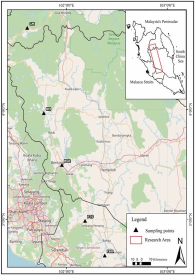 Sampling stations of serpentinite topsoil in a few states in Peninsular Malaysia. Abbreviations: GM—Gua Musang, BM—Batu Malim, BSR—Bentong Spine Road, PTS—Petasih, FBR—Felda Bukit Rokan.