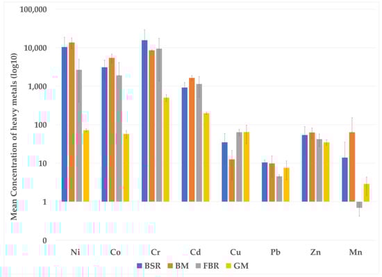 For BM samples (Figure 4B), only Zn and Cu showed a high percentage (4–6%) in the first three fractions, F1 -F3. Other heavy metals showed a very low (1%) to zero percent. All heavy metals except Mn were tightly bound to F7 (84%), and Mn was distributed between F7 (50%) and F6 (36%). The arrangement of heavy metals according to their bioavailability and mobility was Zn > Cu > Pb > Cr > Mn > Co > Cd > Ni.